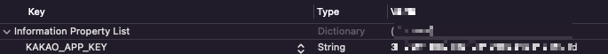 프로젝트의 Info.plist를 열고 Key는 KAKAO_APP_KEY를 입력하고 Value를 채운다