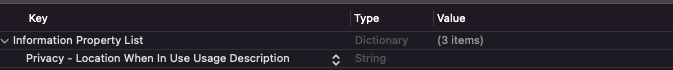Privacy - Location When In Use Usage Description : 앱이 사용중일 때만 가져오기