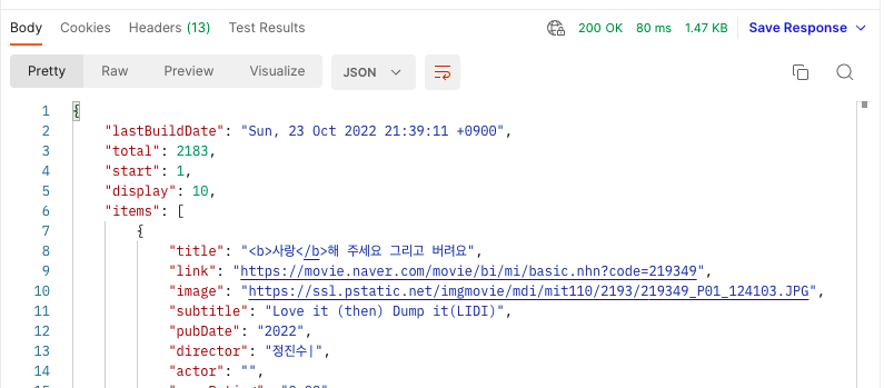 - 영화 검색은 검색 API를 사용해 네이버 검색의 영화 검색 결과를 반환하는 RESTful API로, 영화 검색 결과를 XML형식 또는 JSON 형식으로 반환한다.(API를 호출할 때는 검색어와 검색 조건을 쿼리 스트링 형식의 데이터로 전달)