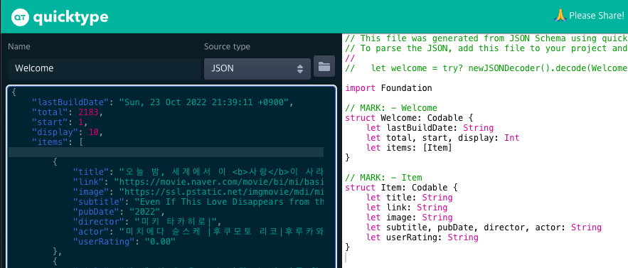 api통신 응답을 프로젝트에 적용시키려면 JSON 응답 형태를 struct로 바꿔줘야 한다.