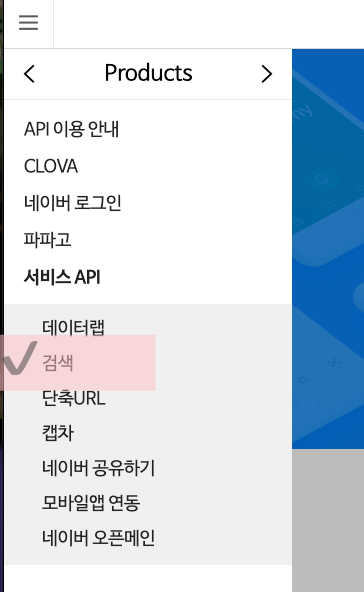 Products > 서비스 API > 검색 을 들어가서 아래에 '오픈 API 이용 신청'을 들어가서 발급받는다