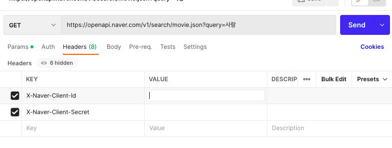 Headers에 위에서 발급 받은 클라이언트 아이디와 시크릿 값을 추가한다