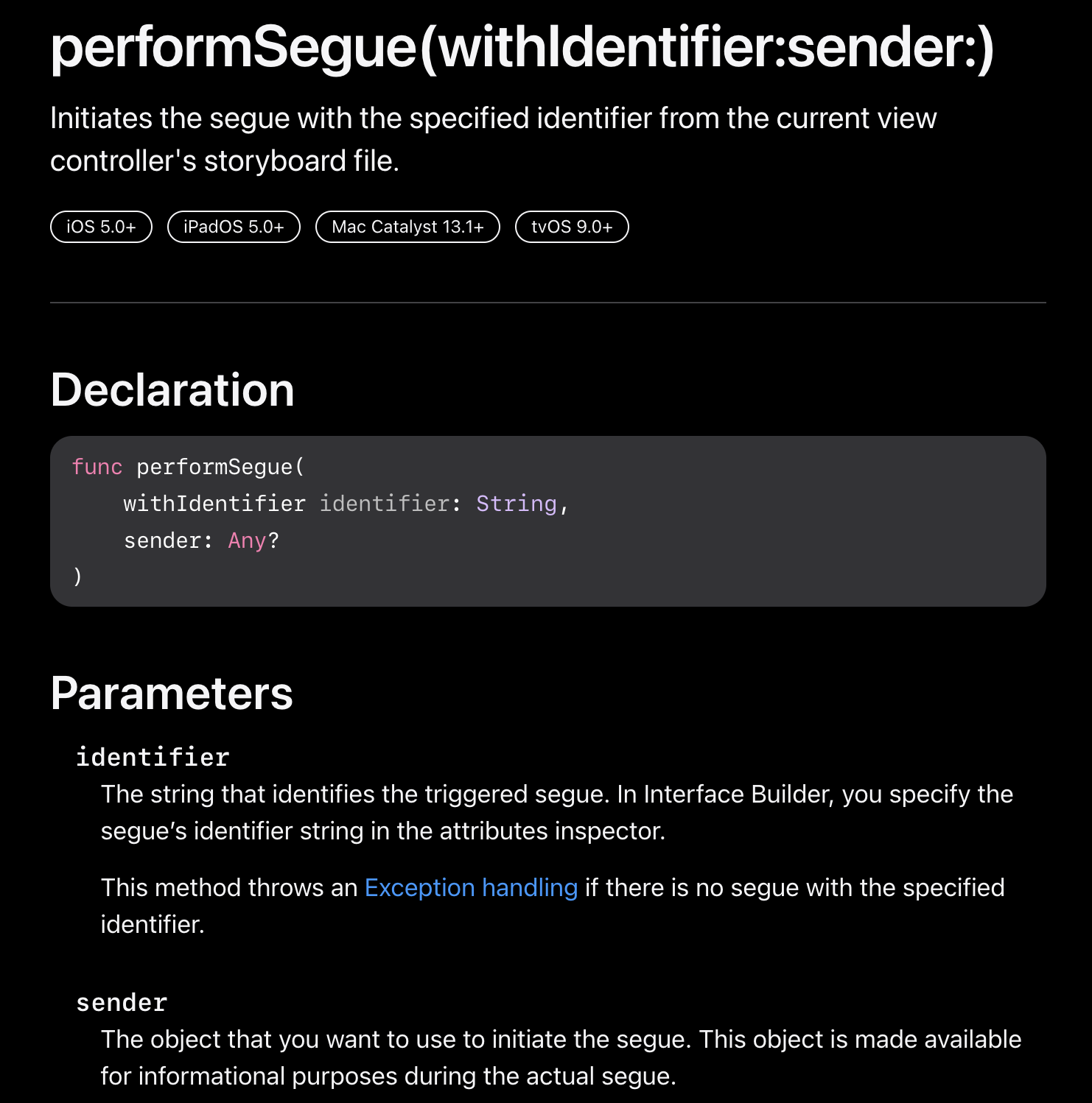 현재 뷰컨트롤러의 스토리보드 파일에서 지정한 identifier 을 이용해 segue를 시작한다.