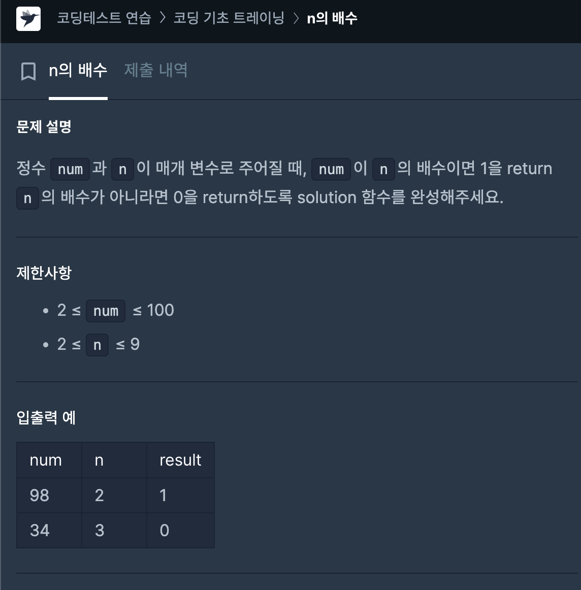 그냥 단순하게 num을 n으로 나눈 나머지가 0인가를 비교해서